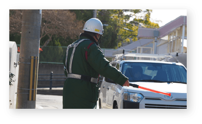 工事現場・建設現場にて、お客様と工事車両、ご通行の皆様へ的確な誘導を行い、事故防止ならびに交通渋滞などのトラブルを未然に防ぎます。地域にお住まいの方やドライバー、歩行者の皆様に対しては、安心して通行していただけるよう、わかりやすく丁寧な誘導を心がけております。